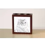 Wir präsentieren Ihnen einen einzigartigen Holzständer für Stifte, der sich perfekt auf jedem Schreibtisch macht. Dieses stilvolle Bürogadget verfügt über drei Stifthalter, die Ordnung und einfachen Zugang zu Ihren Lieblingsschreibutensilien gewährleisten. Das zentrale Element des Ständers ist eine Keramikplatte mit einem Aufdruck, den Sie vollständig personalisieren können. Wir bieten Grafiken von Hunden, Katzen und Pferden an, aber wir drucken auch gerne ein Foto Ihres Haustieres! Auf Wunsch können wir auch den Namen darauf platzieren. Das Foto kann in Farbe oder in der "Bleistiftskizze"-Version fixiert werden, wie Sie es auf den Bildern in diesem Angebot sehen.