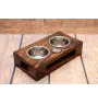 Wir präsentieren einen handgefertigten Doppelnapfständer für Hunde, der Funktionalität mit Eleganz verbindet. Hergestellt in Polen, besteht er aus massivem Holz, was Langlebigkeit und hohe Qualität garantiert. Der Ständer hat eine klassische rechteckige Form, die sich perfekt in jedes Interieur einfügt. Verziert mit einer versilberten Flachrelief-Skulptur einer Rassehundes wird er nicht nur zu einem praktischen, sondern auch zu einem dekorativen Element. Im Set enthalten sind zwei Edelstahlnäpfe, die hygienisch und leicht zu reinigen sind.