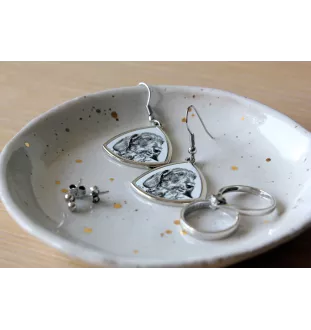 Suchen Sie nach ungewöhnlichem Schmuck für Hunde- oder Katzenliebhaber? Unsere Ohrringe werden sicherlich jede Frau begeistern, die gerne die Nähe zu ihrem Haustier in originellen Accessoires betont. In der Kollektion finden Sie hängende Ohrringe mit Grafiken von Hunden, Katzen und Pferden. Machen Sie sich keine Sorgen, wenn Sie kein passendes Muster finden - dieses Produkt kann personalisiert werden! Das übermittelte Foto kann in Originalfarben gedruckt oder in eine "Bleistiftskizze" umgewandelt werden, die in diesem Angebot sichtbar ist.