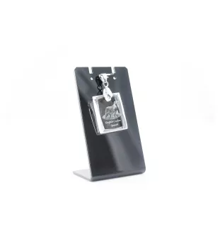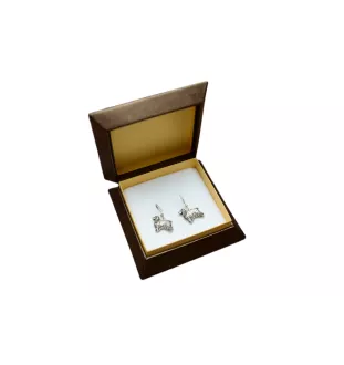 Diese handgefertigte, hölzerne Urne zeichnet sich durch hohe Ästhetik und klassisches Design aus. Der Behälter ist mit einem hölzernen Kranz verziert und verfügt über bequeme, messingfarbene Griffe. Auf der zentralen Stelle des Deckels ist eine einzigartige Statue aus der Art-Dog-Kollektion dauerhaft befestigt. Die Hundestatue zeigt die charakteristischen Merkmale des Rasseaussehens. Der Deckel kann leicht abgenommen werden, um die Asche im Inneren der Urne zu platzieren.