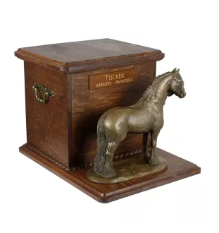 Die handgefertigte Urne aus Birkenholz ist mit ästhetischen Kränzen verziert, und ihr zentraler Punkt ist eine Statue mit der Silhouette eines Pferdes. Die Figur ist fest auf dem abnehmbaren Deckel angebracht. Die Urne ist mit bequemen Messinggriffen ausgestattet.