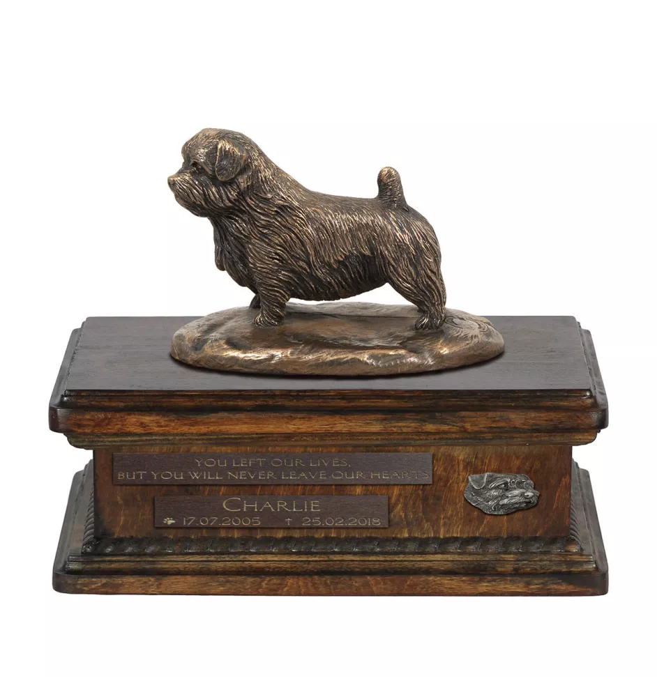 Norfolk Terrier urne in Hundeasche, personalisierte Urne mit Statue, Holzurne mit Hund von Art-Dog