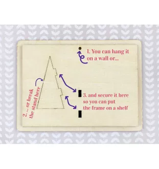 Der Rahmen ist aus Birkensperrholz gefertigt und mit einer charmanten Gravur verziert. Er hat ein Loch für die Wandmontage und eine Halterung, mit der Sie den Rahmen auf ein Regal oder einen Schreibtisch stellen können (siehe Anleitung auf dem Foto). Der Rahmen ist so gestaltet, dass sich am oberen Rand ein Schlitz befindet, durch den Sie Ihr Foto schieben müssen.