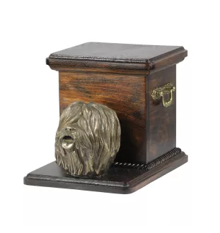 Polnischer Niederungshütehund, PON - Eine Urne für die Asche eines Hundes mit einer Statuette, eine elegante Urne für einen Hund, eine außergewöhnliche Urne mit dem Porträt eines Hundes von der Marke