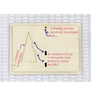 Der Rahmen ist aus Birkensperrholz gefertigt und mit einer charmanten Gravur verziert. Er hat ein Loch für die Wandmontage und eine Halterung, mit der Sie den Rahmen auf ein Regal oder einen Schreibtisch stellen können (siehe Anleitung auf dem Foto). Der Rahmen ist so gestaltet, dass sich am oberen Rand ein Schlitz befindet, durch den Sie Ihr Foto schieben müssen.
