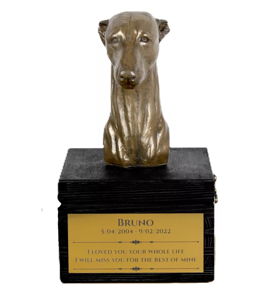Whippet, Kleiner Englischer Windhund - eine Urne mit Gravur und Hundeskulptur, letzter Abschied, handgefertigtes Produkt der Marke Art-Dog