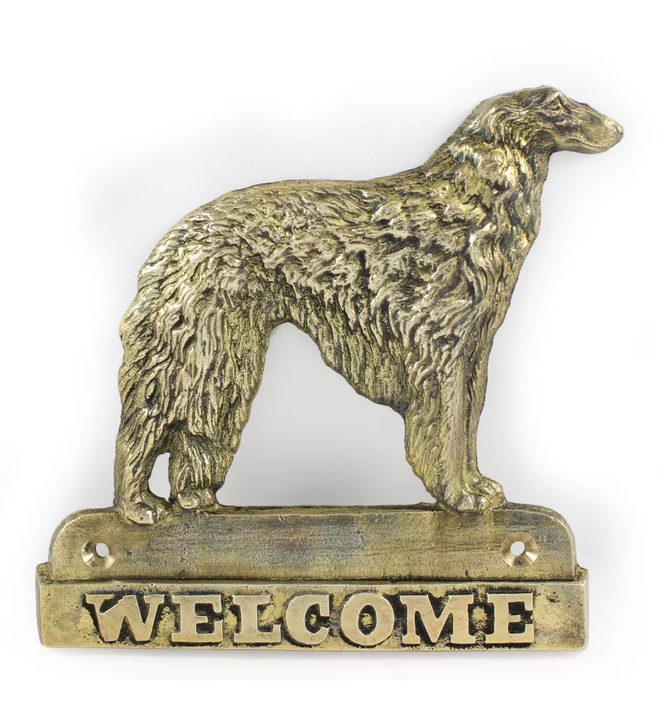 Borzoi, Russian Hunting Sighthound, Russian Wolfhound - a door sign with a dog, a brass welcome plaque, a unique sign with the inscription Welcome from the Art-Dog brand