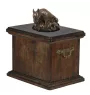 Handcrafted from birch wood, the urn is decorated with aesthetic wreaths, and its centerpiece is a statue with the likeness of a dog. The figurine is securely attached to a removable lid. The urn is equipped with convenient brass handles.