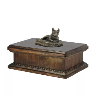 This handmade, wooden urn is characterized by high aesthetics and classic design. The container is adorned with a wooden wreath and equipped with convenient brass handles. At the central point of the lid, there is a unique statuette from the Art-Dog collection permanently attached. The figurine of the dog captures the characteristic features of the breed's appearance. You can easily remove the lid to place the ashes inside the urn.