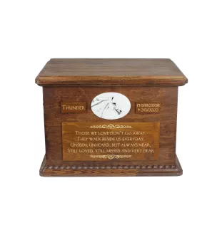 Handmade from birch wood, the urn is designed to allow for full personalization. You can choose a horse image from 50 ready-made graphics. If none of them meet your expectations, we can print a photo of your pet on a tile. The received photo can be processed into a "pencil sketch" version visible in this offer or printed in original colors - the decision is yours. Of course, engraved plates are also subject to personalization. Provide us with the name of your pet, the time frame in which it lived, and if you also want a quote that we will place on a large plate.