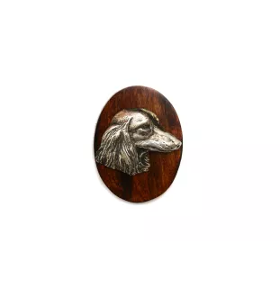 Use this stylish and elegant clip-on brooch to display your dog show entry number. This pin is handmade from wood and decorated with a beautiful silver-plated dog's head corresponding to your pet's breed. It has a safety pin on the back, which you can easily and securely pin the accessory to your clothing, and a clip to grab the number. The clip is tucked away so that you can confidently use the brooch as a decoration even outside of shows. The product is handmade in a small workshop in Poland. Give yourself or a loved one a bit of luxury in the form of such a unique handicraft.
