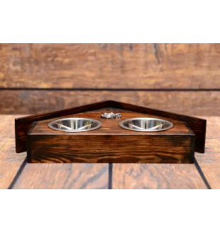 We present a handmade two-bowl stand for a dog, which will certainly become a decoration for any interior. Produced in Poland, it is made of solid wood, which guarantees durability and high quality. The stand has a funny dog house shape, which adds charm and unique character to it. Decorated with a silver-plated bas-relief of a purebred dog, it becomes not only a functional but also a decorative element. The set includes two stainless steel bowls, which are hygienic and easy to clean.