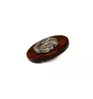 Use this stylish and elegant clip-on brooch to display your dog show entry number. This pin is handmade from wood and decorated with a beautiful silver-plated dog's head corresponding to your pet's breed. It has a safety pin on the back, which you can easily and securely pin the accessory to your clothing, and a clip to grab the number. The clip is tucked away so that you can confidently use the brooch as a decoration even outside of shows. The product is handmade in a small workshop in Poland. Give yourself or a loved one a bit of luxury in the form of such a unique handicraft.