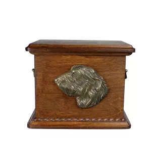 The urn made of birch wood is durable. It has brass handles, a removable cover, and decorations in the shape of a wreath. The cover does not have a latch or seal. To permanently close the urn, the cover should be glued. The dog bas-relief is made with great attention to details characteristic of the specific breed.