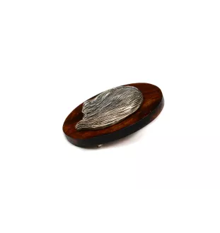 Use this stylish and elegant clip-on brooch to display your dog show entry number. This pin is handmade from wood and decorated with a beautiful silver-plated dog's head corresponding to your pet's breed. It has a safety pin on the back, which you can easily and securely pin the accessory to your clothing, and a clip to grab the number. The clip is tucked away so that you can confidently use the brooch as a decoration even outside of shows. The product is handmade in a small workshop in Poland. Give yourself or a loved one a bit of luxury in the form of such a unique handicraft.