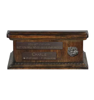 This unique urn is designed to allow for personalization. The wooden plaques visible on the front will be engraved with details provided by you, such as the dog's name, date of birth and death, as well as a quote. An aesthetic silver emblem with a depiction of the breed will enhance the composition. This handmade, wooden urn is characterized by high aesthetics and classic design. The container is adorned with a wooden wreath and equipped with convenient brass handles. At the central point of the lid, there is a unique statuette from the Art-Dog collection permanently attached. The figurine of the dog captures the characteristic features of the breed's appearance. The lid can be easily removed to place the ashes inside the urn.