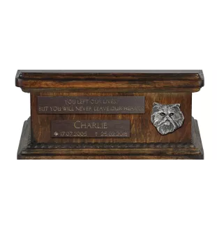 This unique urn is designed to allow for personalization. The wooden plaques visible on the front can be engraved with details provided by you, such as the cat's name, date of birth and death, and a quote. An aesthetic silver emblem with the likeness of the breed will enhance the composition.