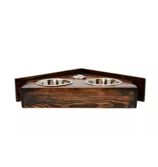 We present a handmade two-bowl stand for a dog, which will certainly become a decoration for any interior. Produced in Poland, it is made of solid wood, which guarantees durability and high quality. The stand has a funny dog house shape, which adds charm and unique character to it. Decorated with a silver-plated bas-relief of a purebred dog, it becomes not only a functional but also a decorative element. The set includes two stainless steel bowls, which are hygienic and easy to clean.
