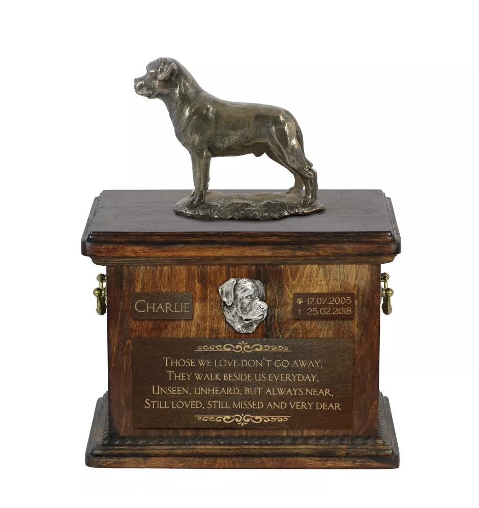 Rottweiler, Rott, Rottie II - urn for dog ashes, urn with a statuette, personalized urn for dog ashes by Art-Dog brand