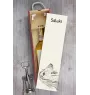 The box is made of wood, and its lid is made of MDF. The print is durable and resistant to fading. There is a convenient handle with a string on top of the box, and inside there is a latch holding the bottle in place during carrying. The box is sized to fit a standard wine bottle.
