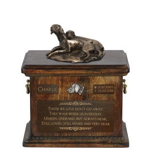 Handcrafted from birch wood, the urn is adorned with aesthetic wreaths, with the central feature being a statue of a dog. The figurine is securely attached to a removable lid. The urn is equipped with convenient brass handles. The front of the urn features engraved plaques with text that can be customized. Provide your dog's name, date of birth and death, and if desired, a quote, and we will engrave it on the urn, creating a unique memorial for your pet.