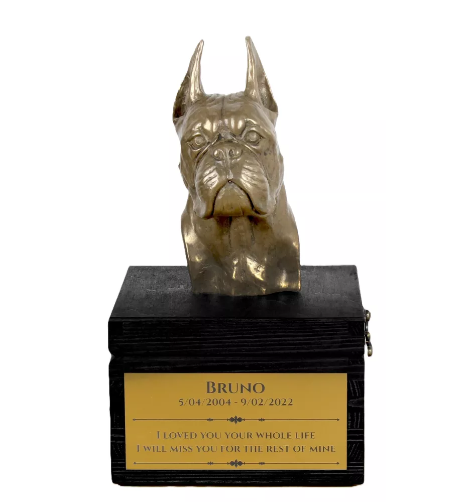 Boxer - une urne avec une gravure et une sculpture de chien, un dernier adieu, un produit fait à la main de la marque Art-Dog