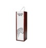 La boîte est en bois, avec un couvercle en MDF. L'impression est durable et résistante à la décoloration. Il y a une poignée pratique en corde sur le dessus de la boîte, et à l'intérieur se trouve un loquet maintenant la bouteille en place pendant le transport. La boîte est de taille standard pour une bouteille de vin.