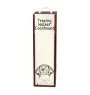 La boîte est en bois, avec un couvercle en MDF. L'impression est durable et résistante à la décoloration. Il y a une poignée pratique en corde sur le dessus de la boîte, et à l'intérieur se trouve un loquet maintenant la bouteille en place pendant le transport. La boîte est de taille standard pour une bouteille de vin.