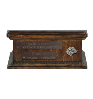 Cette urne unique a été conçue pour permettre une personnalisation. Les plaques de bois visibles à l'avant seront gravées avec les détails que vous fournirez, tels que le nom du chien, la date de naissance et de décès, ainsi qu'une citation. Un emblème argenté estampé avec l'image de la race embellira la composition. Cette urne en bois faite à la main se distingue par son esthétique élevée et son design classique. Décorée d'une couronne en bois, elle est équipée de poignées en laiton pratiques. Au centre du couvercle est solidement fixée une statuette unique de la collection Art-Dog. La figurine du chien reflète les caractéristiques distinctives de la race. Le couvercle peut être facilement retiré pour placer les cendres à l'intérieur de l'urne.