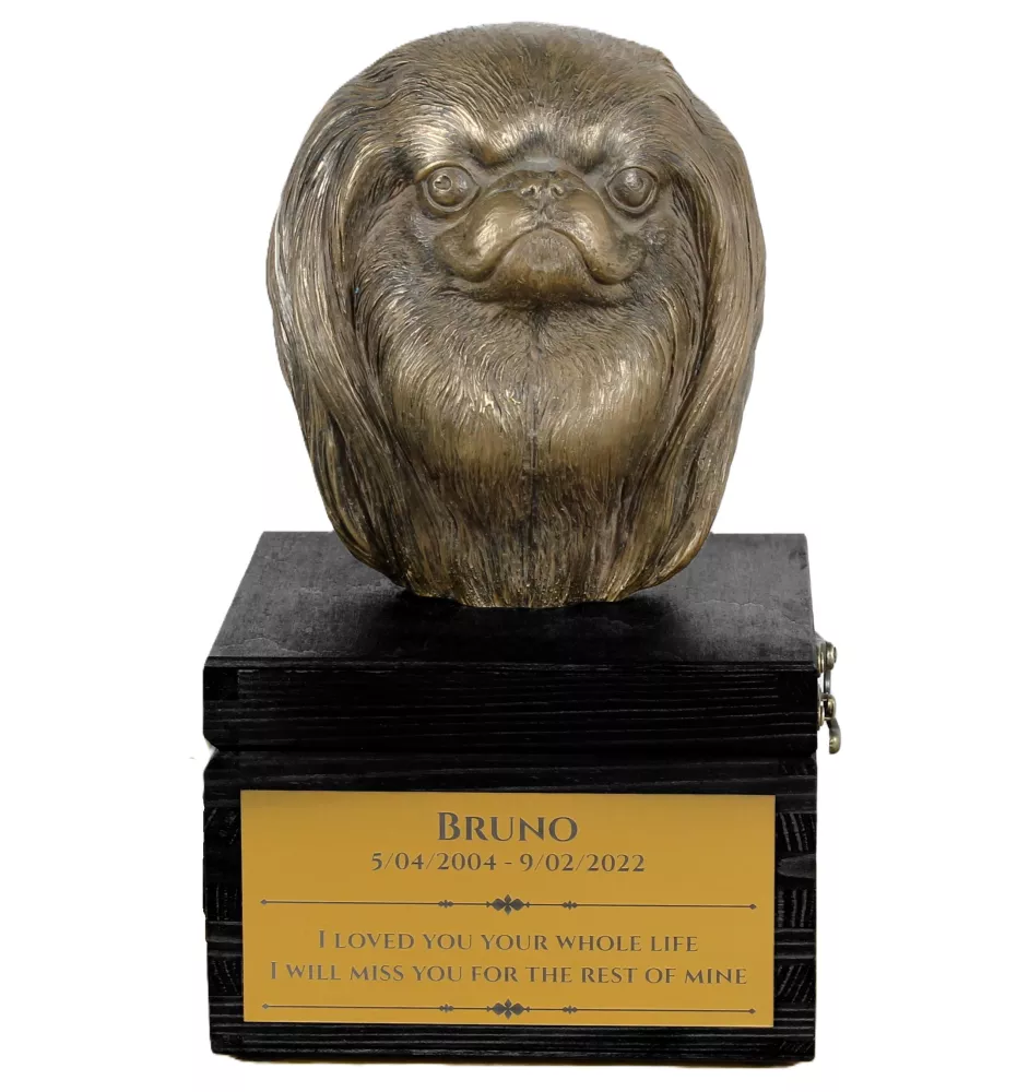 Épagneul japonais, Chin - une urne avec une gravure et une sculpture de chien, un dernier adieu, un produit fait à la main de la marque Art-Dog