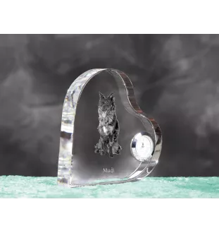 Nous présentons une élégante montre en cristal en forme de cœur, qui deviendra un décor exceptionnel sur chaque étagère, rebord de fenêtre ou bureau. Fabriquée en cristal de haute qualité, la montre se caractérise par une transparence impeccable et une finition parfaite. À l'intérieur du cristal se trouve une photo d'animal immortalisée, que vous pouvez personnaliser en nous envoyant une photo de votre animal de compagnie. Ainsi, chaque montre devient unique et personnelle.