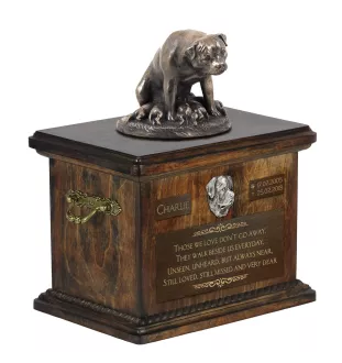 Fabriquée à la main en bois de bouleau, l'urne est décorée de couronnes esthétiques, et sa pièce centrale est une statuette représentant un chien. La figurine est solidement fixée au couvercle amovible. L'urne est équipée de poignées en laiton pratiques. Sur le devant de l'urne se trouvent des plaques gravées avec du texte que vous pouvez modifier à votre guise. Indiquez le nom de votre chien, sa date de naissance et de décès, ainsi que - si vous le souhaitez - une citation, et nous l'ajouterons à l'urne pour créer un lieu de mémoire unique pour votre compagnon.