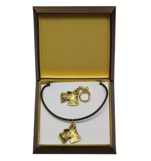 Terrier écossais, Scottish terrier I - porte-clés et collier avec chien dans une boîte, produit plaqué or de haute qualité, marque Art-Dog