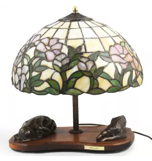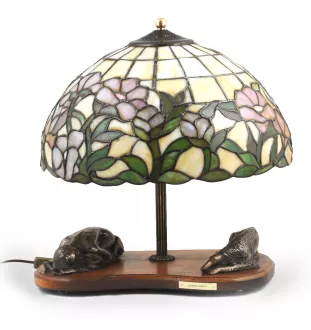 Dla wszystkich miłośników eleganckich dekoracji oraz wyjątkowego oświetlenia mamy przyjemność zaprezentować naszą lampę w stylu retro. Ta niezwykła lampa, wyposażona w witrażowy abażur wykonany ręcznie ze szkła, stanie się prawdziwą ozdobą każdego wnętrza. Podstawa lampy jest ozdobiona realistyczną statuetką psa, wykonaną z materiału doskonale imitującego brąz, co nadaje jej wyjątkowy charakter.