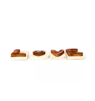 Ręcznie wykonane z litego drewna litery składają się na napis LOVE. Każdą literę postawisz oddzielnie na swojej półce lub regale z książkami (napis nie posiada mocowania do powieszenia liter na ścianie). Litera O jest ozdobiona piękną, posrebrzaną płaskorzeźbą przedstawiającą psa rasowego - w ofercie dostępnych jest ponad 100 ras psów.