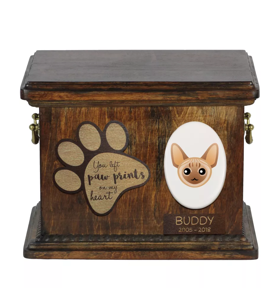 Ta piękna urna jest w pełni personalizowana - poza imieniem i datami życia kota, możemy zmienić cytat umieszony na drewnianej łapie, jak i wymienić geometryczny wizerunek na kolorowe zdjęcie Twojego futrzanego przyjaciela. Z nami możesz stworzyć naprawdę unikatowe miejsce spoczynku dla Twojego ulubieńca!