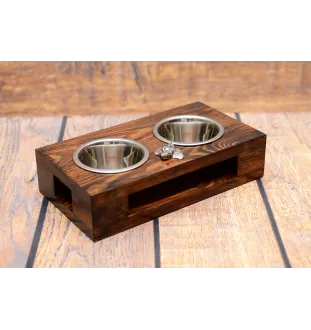 Przedstawiamy ręcznie wykonany stojak na dwie miski dla psa, który łączy funkcjonalność z elegancją. Wyprodukowany w Polsce, wykonany jest z litego drewna, co gwarantuje trwałość i wysoką jakość. Stojak ma klasyczny, prostokątny kształt, który doskonale wpasuje się w każde wnętrze. Ozdobiony posrebrzaną płaskorzeźbą psa rasowego, staje się nie tylko praktycznym, ale i dekoracyjnym elementem. W zestawie znajdują się dwie stalowe miski, które są higieniczne i łatwe do czyszczenia.