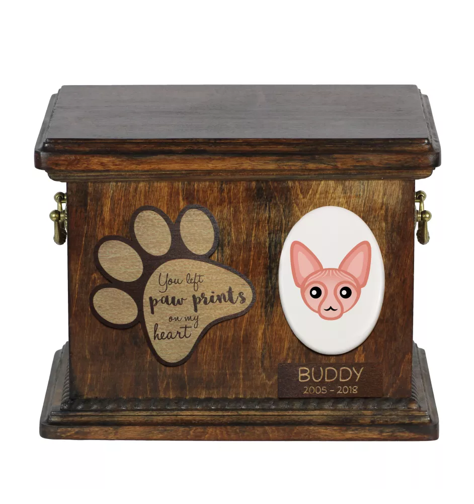 Ta piękna urna jest w pełni personalizowana - poza imieniem i datami życia kota, możemy zmienić cytat umieszony na drewnianej łapie, jak i wymienić geometryczny wizerunek na kolorowe zdjęcie Twojego futrzanego przyjaciela. Z nami możesz stworzyć naprawdę unikatowe miejsce spoczynku dla Twojego ulubieńca!