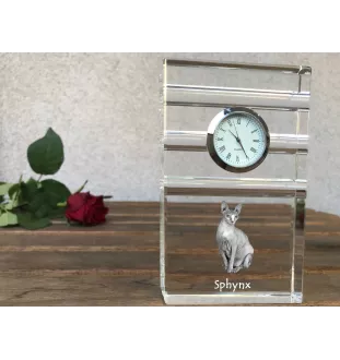 Statuetka wykonana jest z wysokiej jakości kryształu, który cechuje się świetną przejrzystością. Zegar ma analogową tarczę i klasyczne wskazówki, wyposażony jest też w baterię. Kryształowy zegar ma wewnątrz wygrawerowane zdjęcie zwierzaka. Możemy dodać temu zegarkowi osobistego uroku przez utrwalenie w nim zdjęcia Twojego pupila.