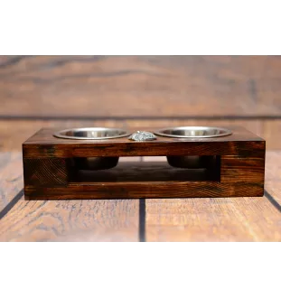 Przedstawiamy ręcznie wykonany stojak na dwie miski dla psa, który łączy funkcjonalność z elegancją. Wyprodukowany w Polsce, wykonany jest z litego drewna, co gwarantuje trwałość i wysoką jakość. Stojak ma klasyczny, prostokątny kształt, który doskonale wpasuje się w każde wnętrze. Ozdobiony posrebrzaną płaskorzeźbą psa rasowego, staje się nie tylko praktycznym, ale i dekoracyjnym elementem. W zestawie znajdują się dwie stalowe miski, które są higieniczne i łatwe do czyszczenia.
